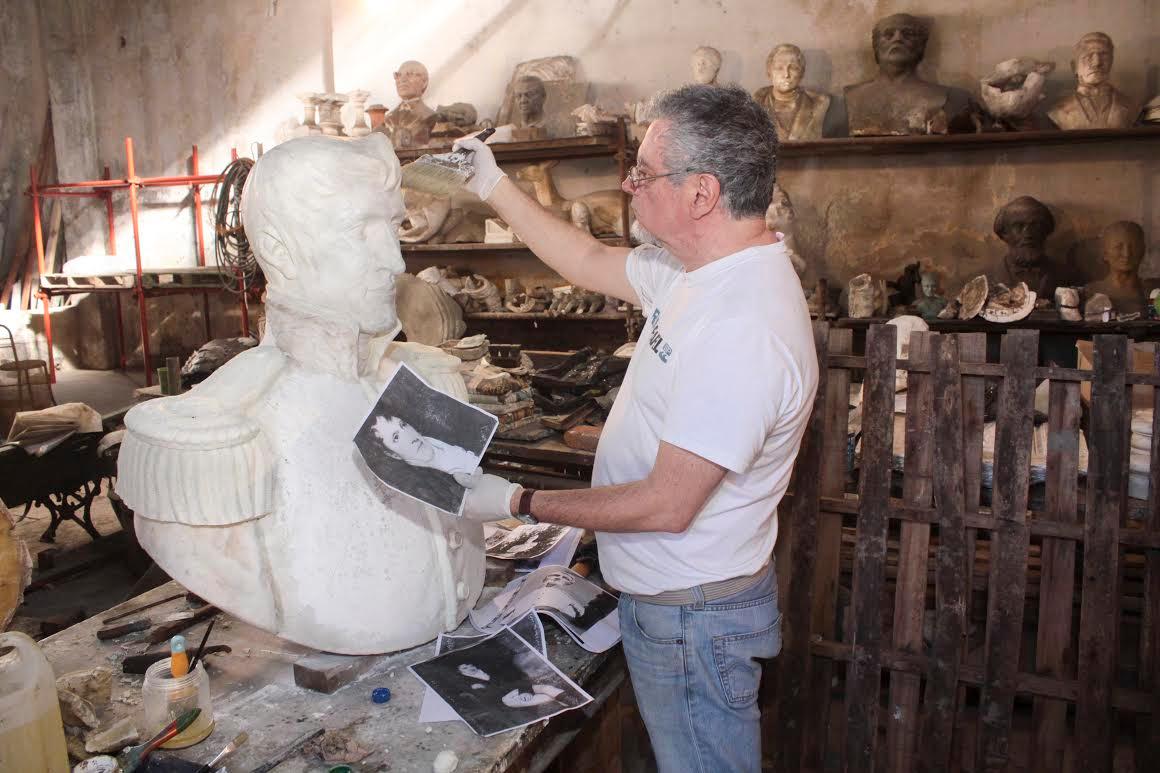 El lugar de trabajo de Gabriel Palacios no se parece a ningún otro. Convive con esculturas, monumentos, bustos, jarrones y placas que necesitan ser restauradas.