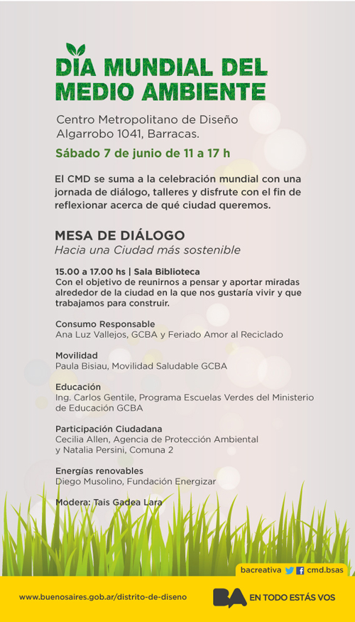 El sábado 7 de junio, el Centro Metropolitano de Diseño (CMD) se sumó a la celebración mundial y realizó una jornada con mesas de diálogo y diferentes talleres. Escuelas Verdes participó del Diálogo en la Mesa “Hacia una Ciudad más sostenible” junto con otros expertos. Pudimos disfrutar de una celebración íntegra dedicada al cuidado del ambiente.
