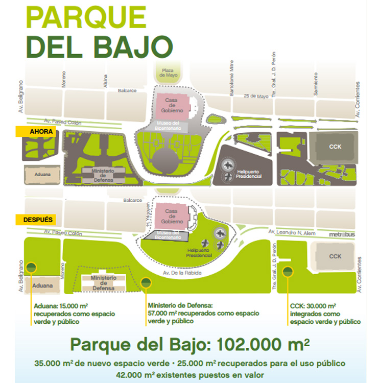 De esta forma, se generarán 60.000 metros cuadrados de nuevo espacio público, de los cuales 35.000 corresponden a nuevo espacio verde. Así, el Parque del Bajo se convertirá en un nuevo pulmón para la Ciudad, tal como lo establece el Plan Verde presentado por el Ministerio de Desarrollo Urbano y Transporte en 2016.