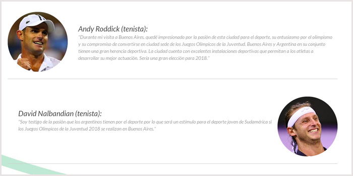 Así como Messi, muchos más deportistas locales e internacionales sumaron su apoyo a la realización de los JOJ en Buenos Aires. El genial tenista Andy Roddick, tras su visita a Buenos Aires afirmó quedar "impresionado por la pasión de esta ciudad para el deporte" y destacó su "entusiasmo por el olimpismo y su compromiso de convertirse en ciudad sede de los Juegos Olímpicos de la Juventud. Buenos Aires". En tanto, su par local David Nalbandian dijo: "Soy testigo de la pasión que los argentinos tienen por el deporte por lo que será un estímulo para el deporte joven de Sudamérica si los Juegos Olímpicos de la Juventud 2018 se realizan en Buenos Aires."