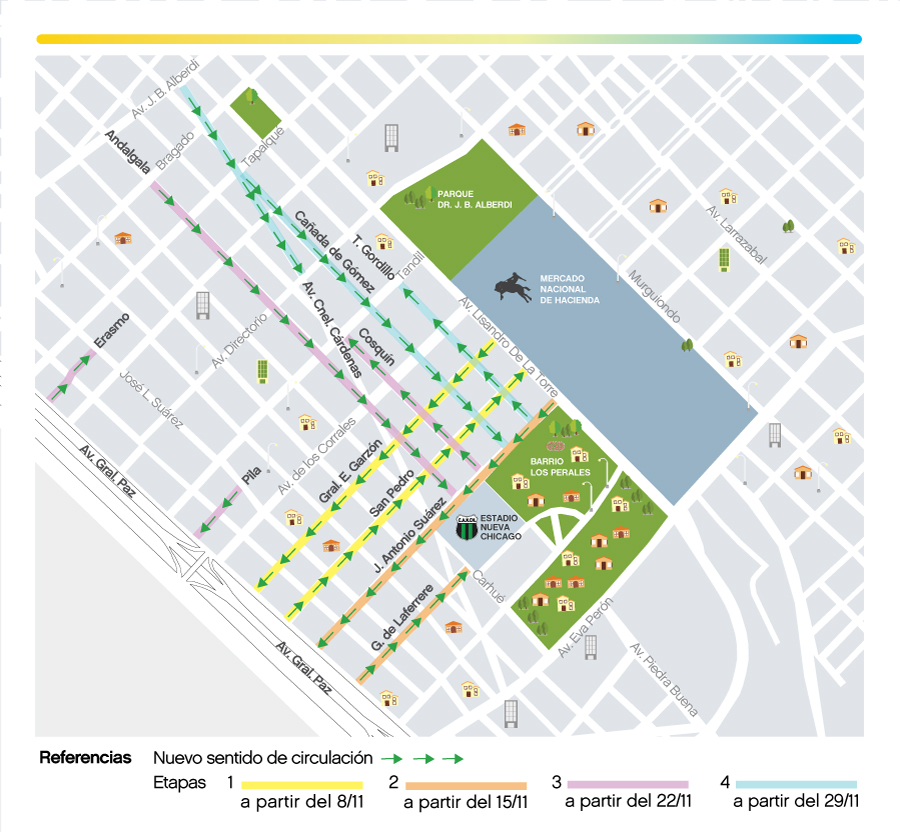 - Coronel Cárdenas, de av. Alberdi a av. Directorio. La circulación pasará de ser doble sentido a mano única en dirección noroeste - sureste. Se podrá estacionar en ambos lados (derecho e izquierdo).