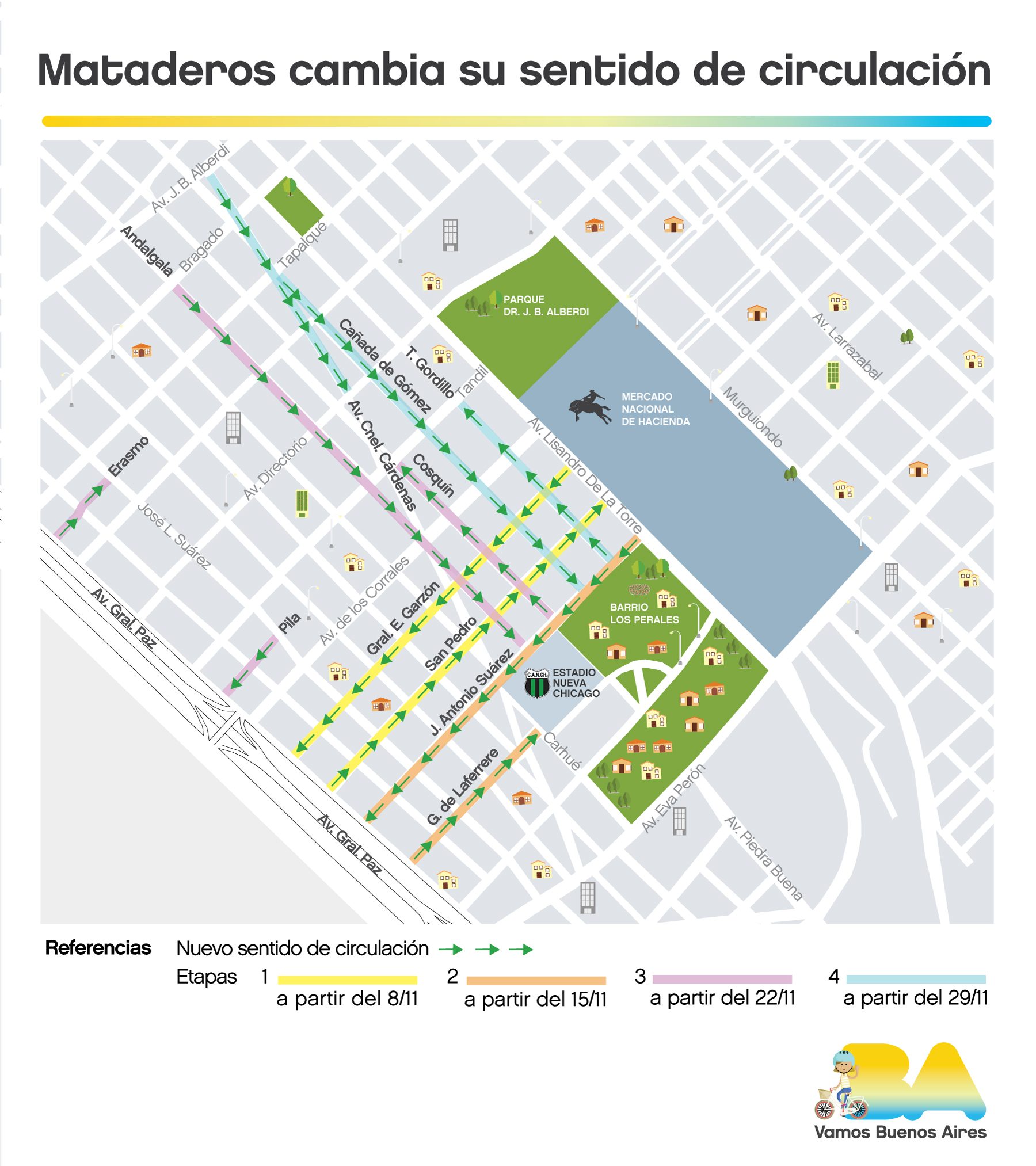 - Etapa 2: Desde el martes 15 de noviembre. Justo Antonio Suárez, de Lisandro de la Torre a Av. Gral. Paz. La circulación pasará de ser doble sentido a mano única en dirección noreste - suroeste. Se podrá estacionar en ambos lados (derecho e izquierdo). Gregorio de Laferrere, de Gral. Paz a Carhué. La circulación pasará de ser doble sentido a mano única en dirección suroeste - noreste. Se podrá estacionar en ambos lados (derecho e izquierdo).