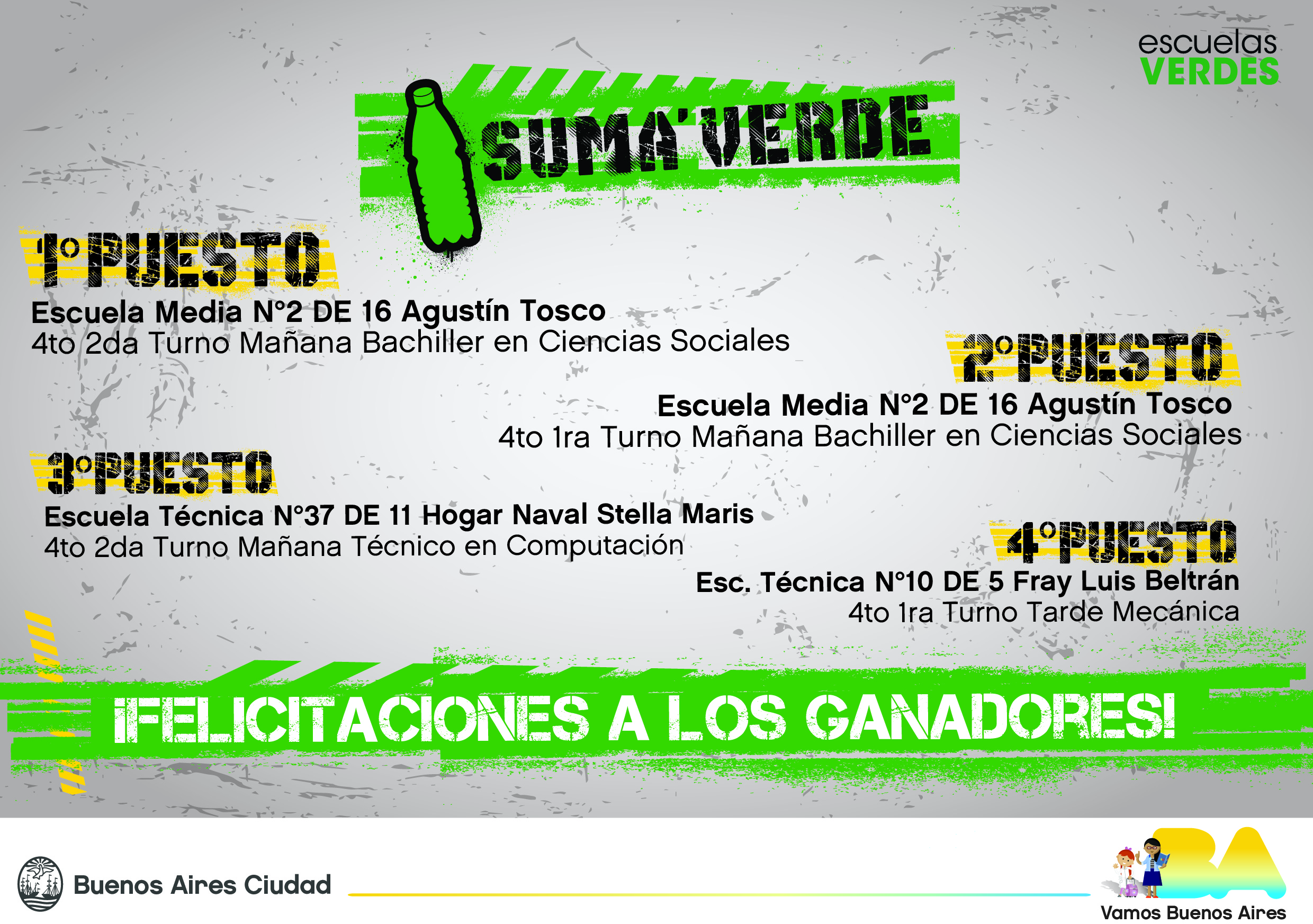 Durante Septiembre y Octubre, y con el objetivo de incentivar el compromiso de los jóvenes con el cuidado del ambiente, el gobierno de la Ciudad de Buenos Aires lanzó Sumá Verde, el concurso que fomenta la separación de los residuos en origen y propone a los alumnos de 4º año de las escuelas de la Capital que separen envases plásticos (PET) y los entreguen en los Puntos Verdes ubicados en plazas y parques de la Ciudad.
