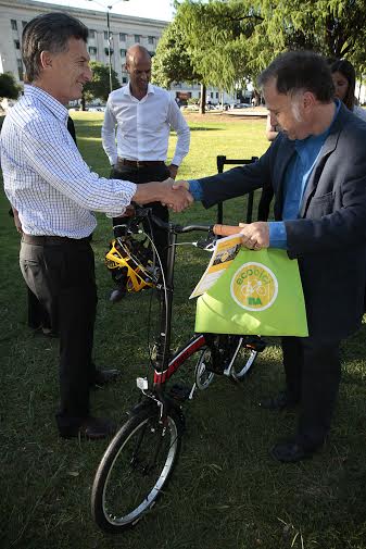“Andar en bici hace bien a la salud, divierte, distrae, es algo maravilloso, una alternativa muy piola que cambia la vida diaria de la gente”, afirmó Macri en la Estación de Ecobici Facultad de Derecho, donde le entregó una bicicleta de regalo a Jorge Schopflocher, un arquitecto de 53 años.