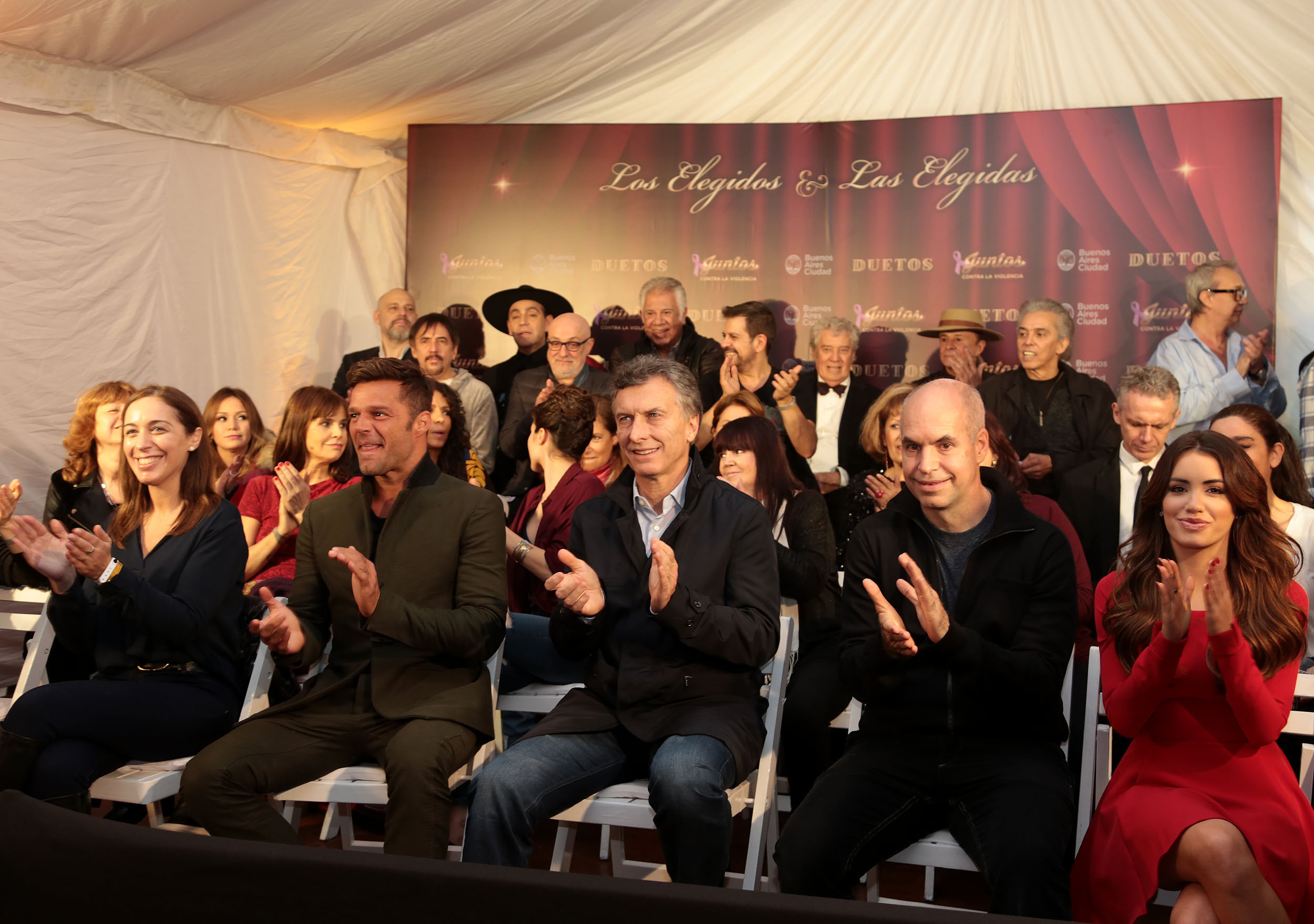 El jefe de Gobierno de la Ciudad de Buenos Aires, Mauricio Macri, saludó al cantante puertorriqueño Ricky Martin, quien participó como figura invitada del show gratuito que dieron “Las Elegidas & Los Elegidos: Duetos” en el Parque de San Benito de Belgrano. “Fue muy lindo ver a hijos, padres y abuelos porque acá se recorre una parte importante de la historia de la música popular argentina, en todos sus gustos, y feliz porque Ricky se entusiasmo y se sumó a la propuesta”, dijo Macri quien asistió junto a la vicejefe de Gobierno, María Eugenia Vidal, y el jefe de Gabinete porteño, Horacio Rodríguez Larreta.