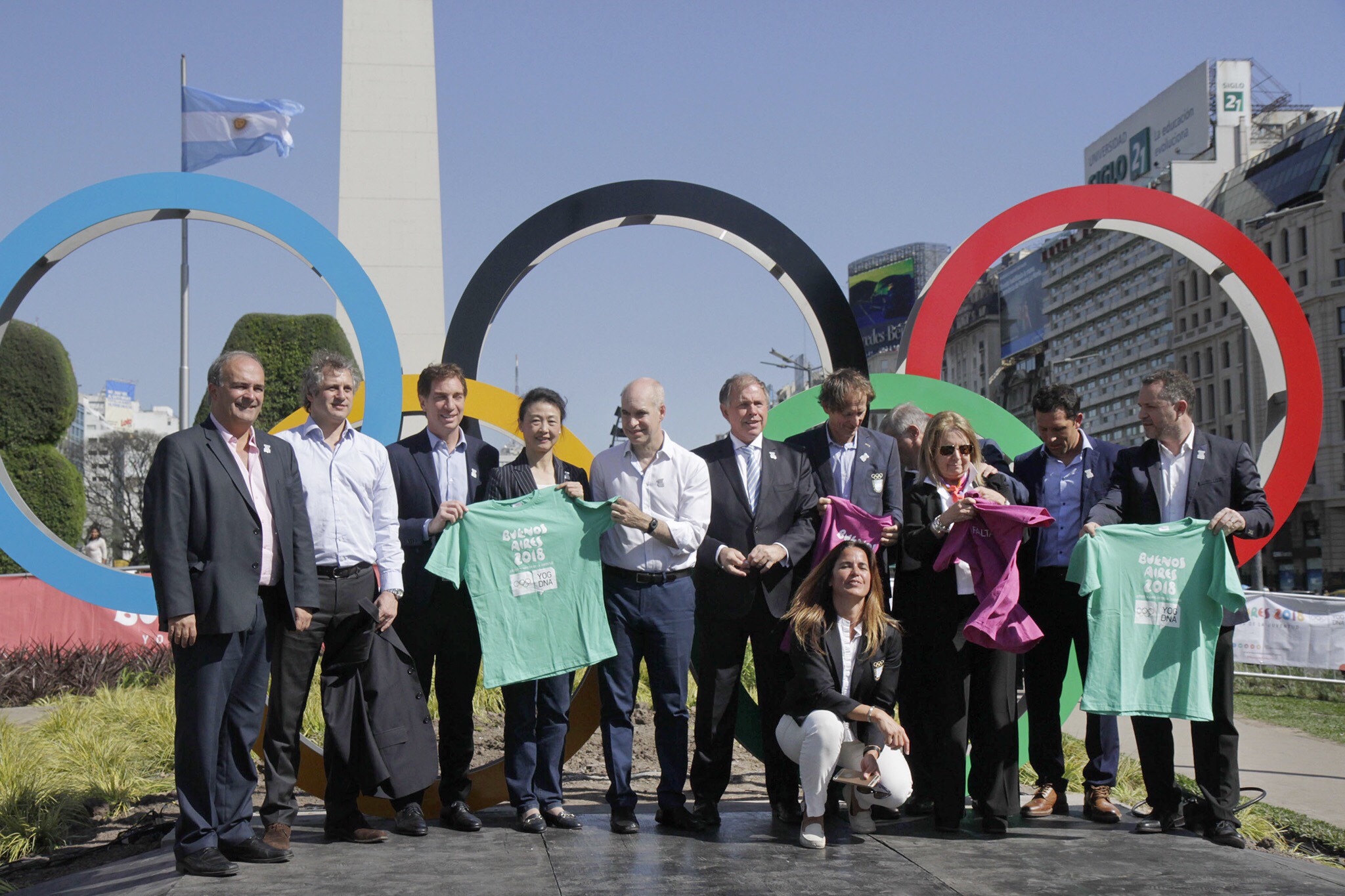 Presentamos los Anillos Olímpicos en el Obelisco, a un año de @BuenosAires2018. pic.twitter.com/kDfdZ50zPP