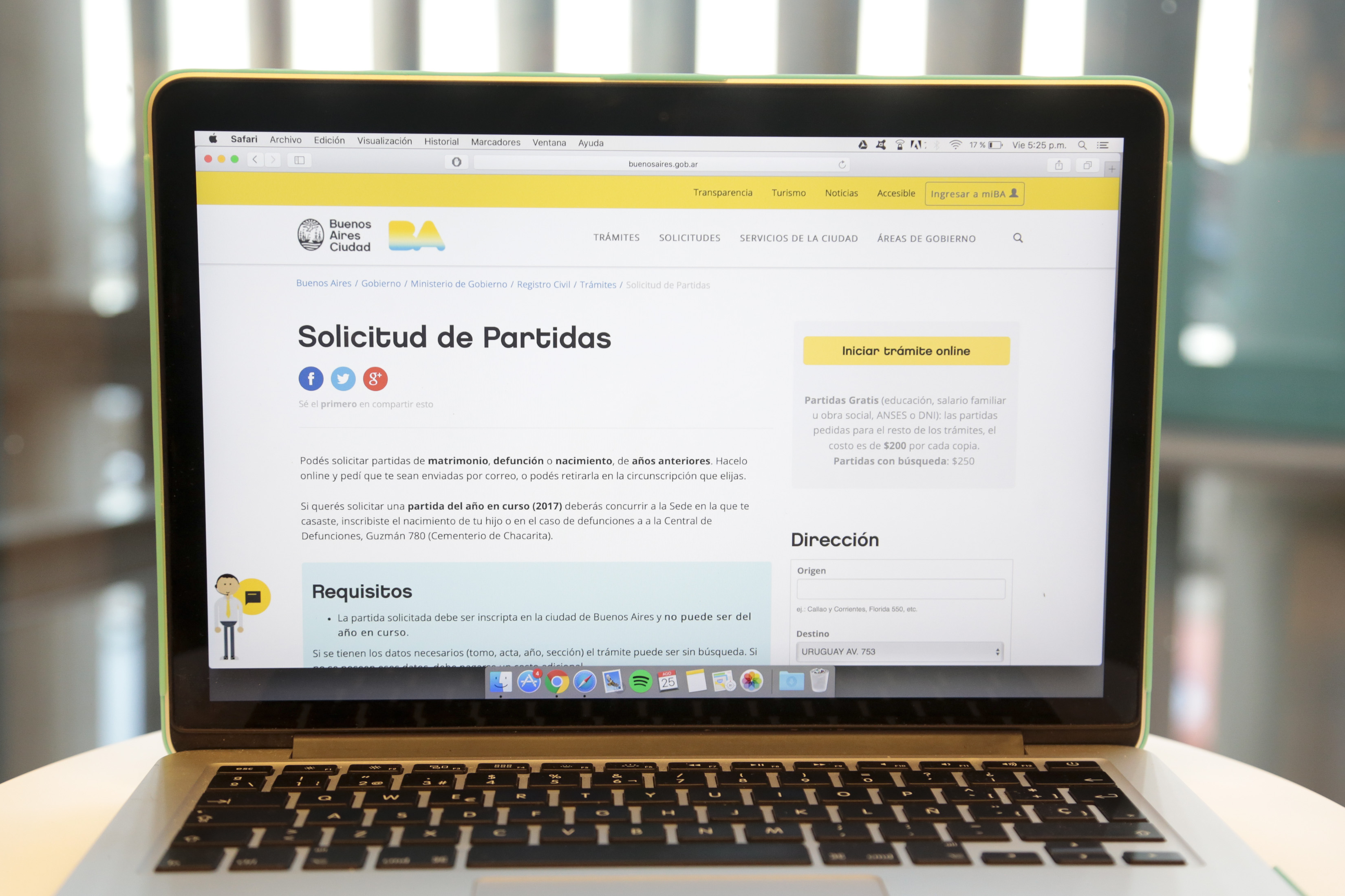 La Ciudad permite obtener partidas de nacimiento, matrimonio o defunción de manera online a través de su Guía de Trámites. Se puede solicitar que sea enviadas por correo, o bien retirarlas en la circunscripción a elección.