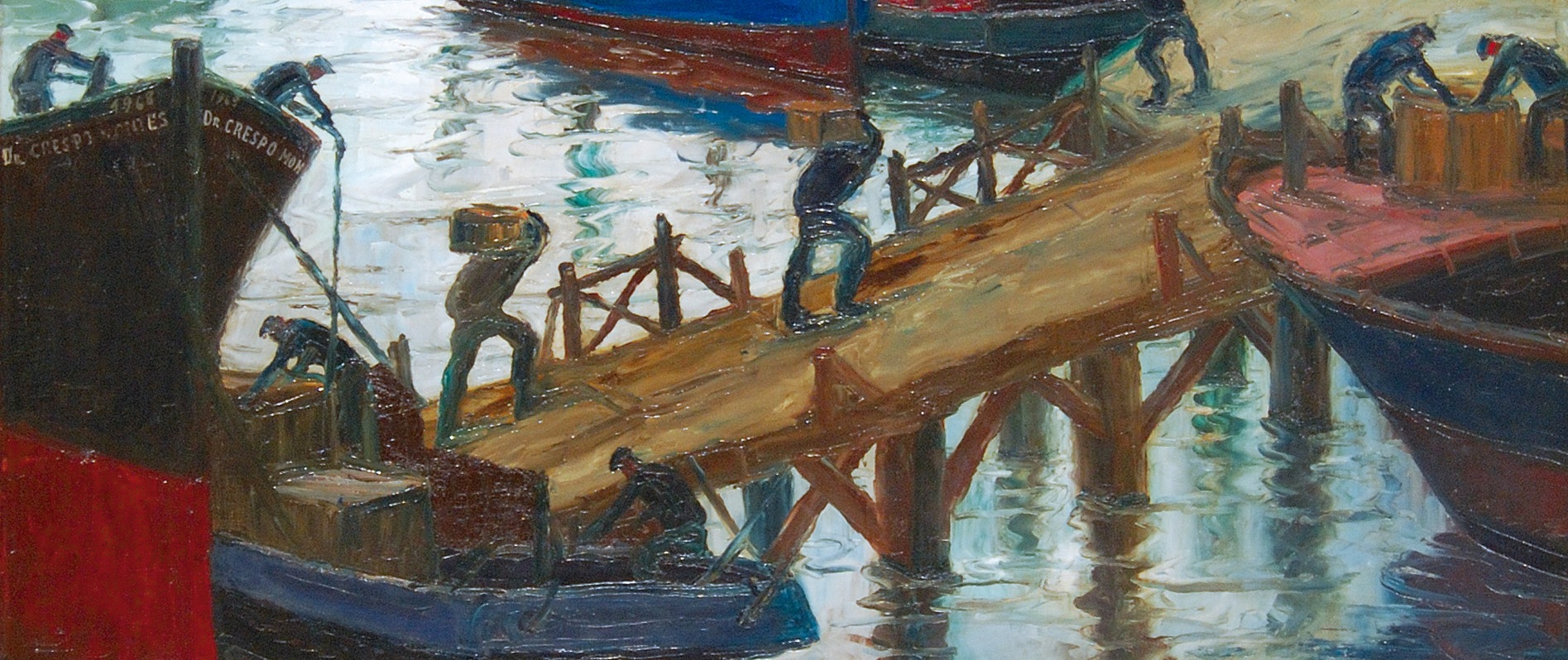 Con un estilo naturalista Benito Quinquela Martin planteó una temática que gira en torno a los barcos mostrando la actividad, vigor y rudeza de la vida diaria de los trabajadores portuarios.
