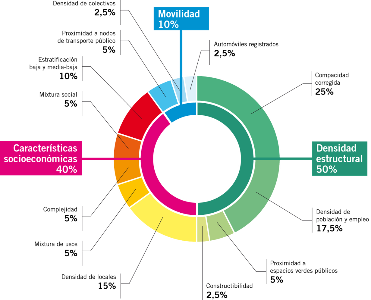 El indicador sintético que mide la prioridad de zonas se conforma a partir de tres grandes temas (densidad estructural, movilidad y características socioeconómicas) y 15 subindicadores.