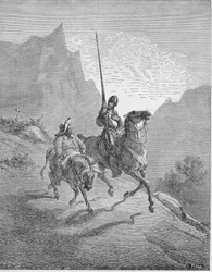Dio luego don Quijote orden en buscar dineros, y, vendiendo una cosa y empeñando otra y malbaratándolas todas, llegó una razonable cantidad. Acomodose asimismo de una rodela que pidió prestada a un su amigo, y, pertrechando su rota celada lo mejor que pudo, avisó a su escudero Sancho del día y la hora que pensaba ponerse en camino, para que él se acomodase de lo que viese que más le era menester. Sobre todo le encargó que llevase alforjas; él dijo que sí llevaría, y que asimismo pensaba llevar un asno que tenía muy bueno, porque él no estaba duecho a andar mucho a pie. En lo del asno reparó un poco don Quijote, imaginando si se le acordaba si algún caballero andante había traído escudero caballero asnalmente, pero nunca le vino alguno a la memoria; mas con todo esto determinó que le llevase, con presupuesto de acomodarle de más honrada caballería en habiendo ocasión para ello, quitándole el caballo al primer descortés caballero que topase. Proveyose de camisas y de las demás cosas que él pudo, conforme al consejo que el ventero le había dado. Todo lo cual hecho y cumplido, sin despedirse Panza de sus hijos y mujer, ni don Quijote de su ama y sobrina, una noche se salieron del lugar sin que persona los viese; en la cual caminaron tanto, que, al amanecer, se tuvieron por seguros de que no los hallarían aunque los buscasen.