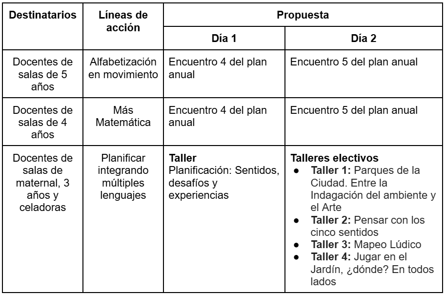 Cada docente participará de dos jornadas, organizadas según DE y sala en la que se desempeñan, cuyo foco estará en el diseño de propuestas diversificadas y recortes didácticos dentro del marco del nuevo diseño curricular para salas de Jardín Maternal, con especial atención en matemática y lengua para salas de 4 y 5.