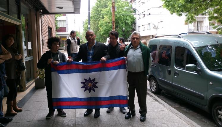 Seguidores uruguayos de Gabino con Claudio Ezeiza y la bandera de Paysandú