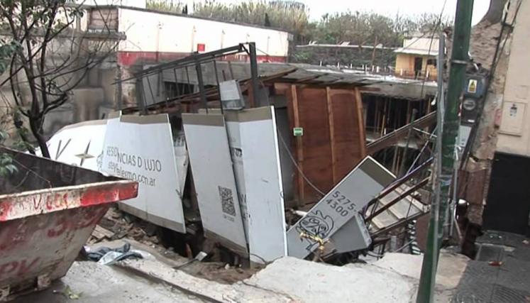El desmoronamiento, que se produjo en una jornada de intensas lluvias, afectó a los subsuelos que se construyen en el lugar y arrastró la vereda y parte del asfalto.