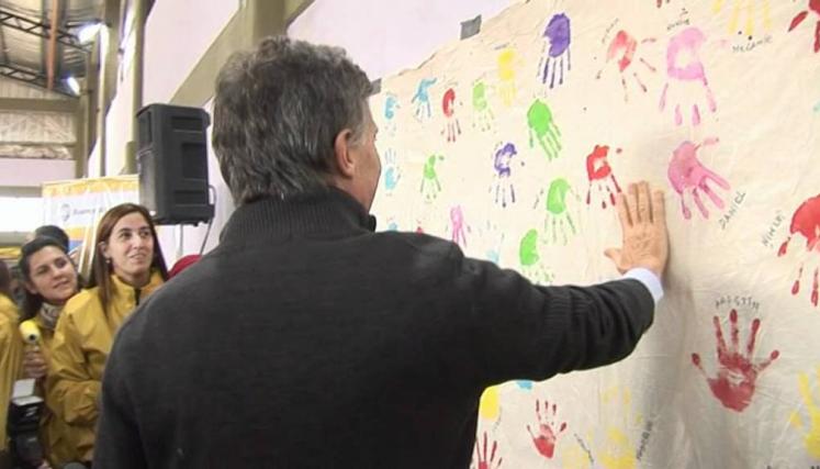 Macri participó de clínicas de tenis y rugby junto a varios de los chicos que participan de esta iniciativa y luego estampó las manos pintadas en una tela de exhibición.