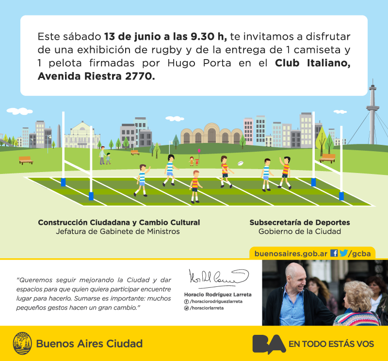 El sábado 13 de junio a las 9.30 horas se realizará una exhibición de rugby en la cual se hará entrega de una camiseta y pelota firmadas por el ex Puma, Hugo Porta, flamante estatua del Paseo de la Gloria, en el Club Italiano, ubicado en la Avenida Riestra 2770.