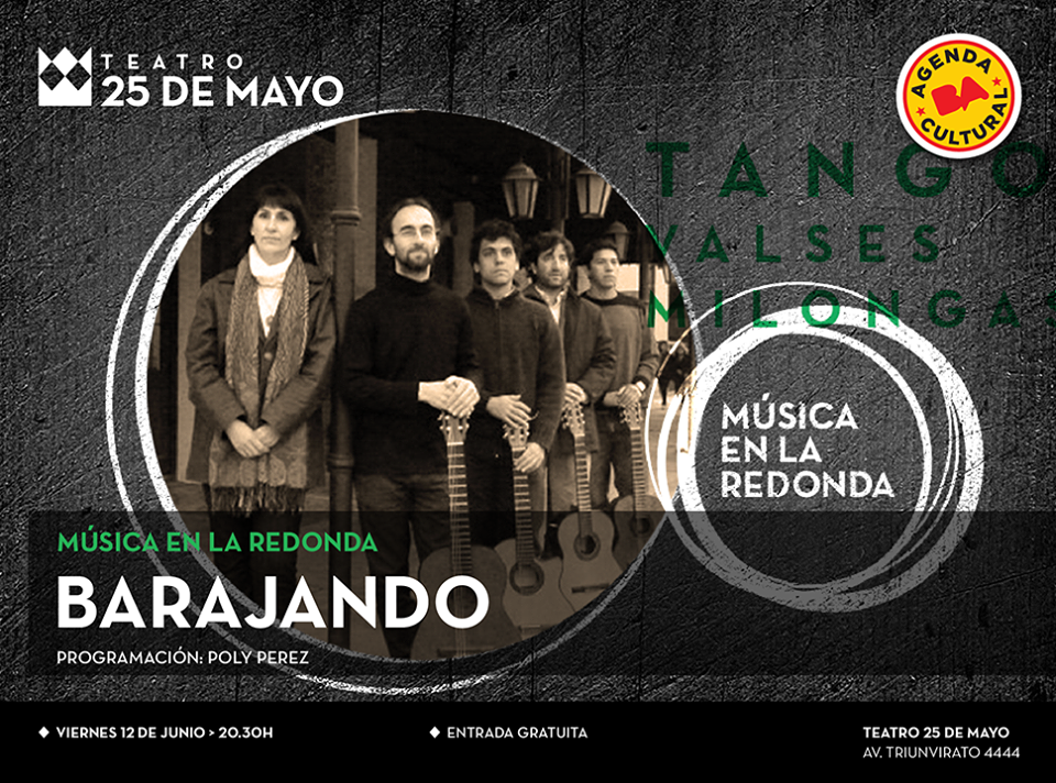 El viernes 12 de junio a las 20.30 h en el ciclo Música en la Redonda se presenta Barajando (tango, valses y milongas) en el Teatro 25 de Mayo (Av. Triunvirato 4444). Entrada gratuita.