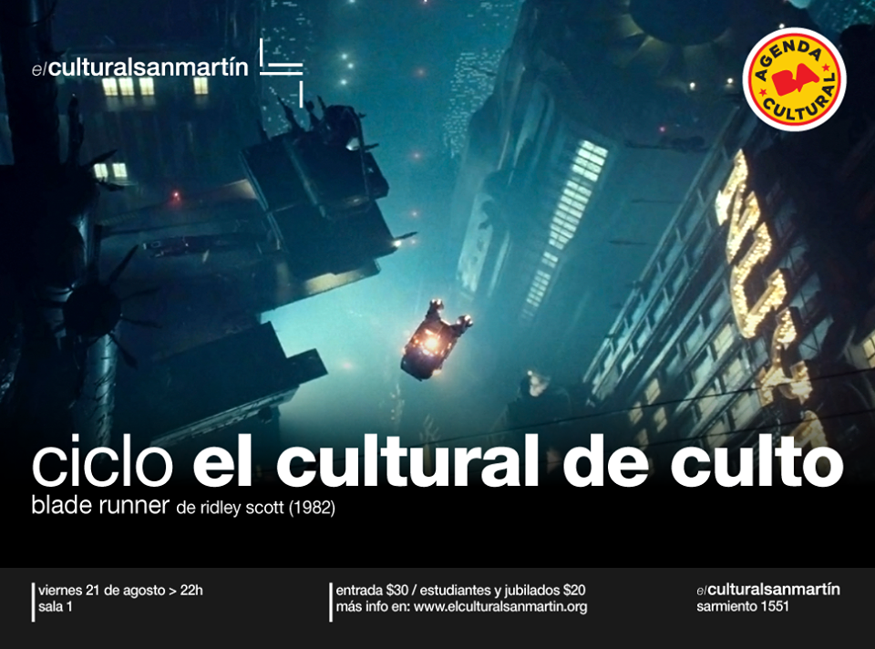 El viernes 21 de agosto a las 22 h continúa el ciclo “El Cultural de Culto” con la proyección de Blade Runner de Ridley Scott (1982). En el Cultural San Martín (Sarmiento 1551). Entrada $30; estudiantes y jubilados $20.