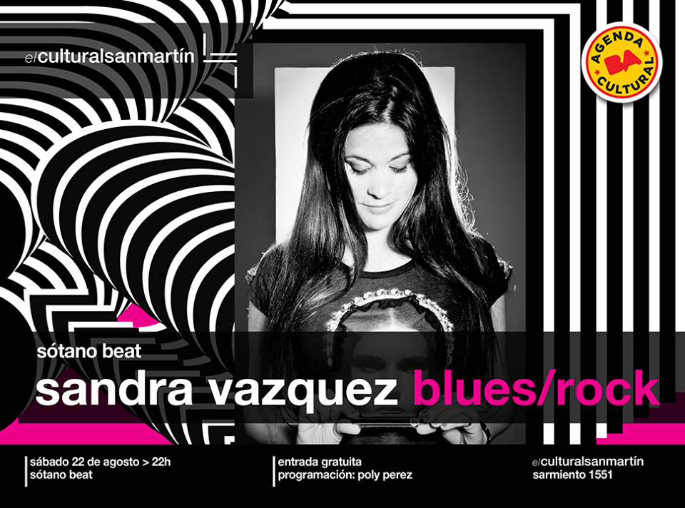 El sábado 22 de agosto a las 22 h en el Sótano Beat del Cultural San Martín (Sarmiento 1551) se presenta Sandra Vazquez, armonicista y cantante, ganadora de un premio Gardel en el 2014 como mejor álbum nuevo artista de rock. Entrada gratuita.