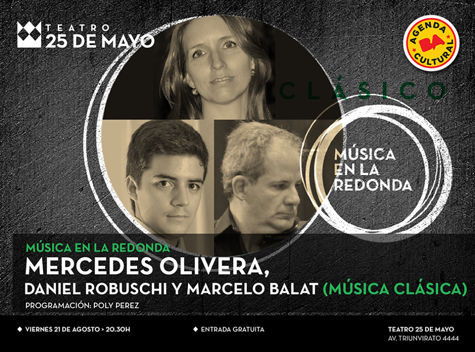 El viernes 21 de agosto a las 20.30 h en el ciclo Música en la Redonda se presentan Mercedes Olivera - Daniel Robuschi y Marcelo Balat (música clásica) en el Teatro 25 de Mayo (Av. Triunvirato 4444). Entrada gratuita.