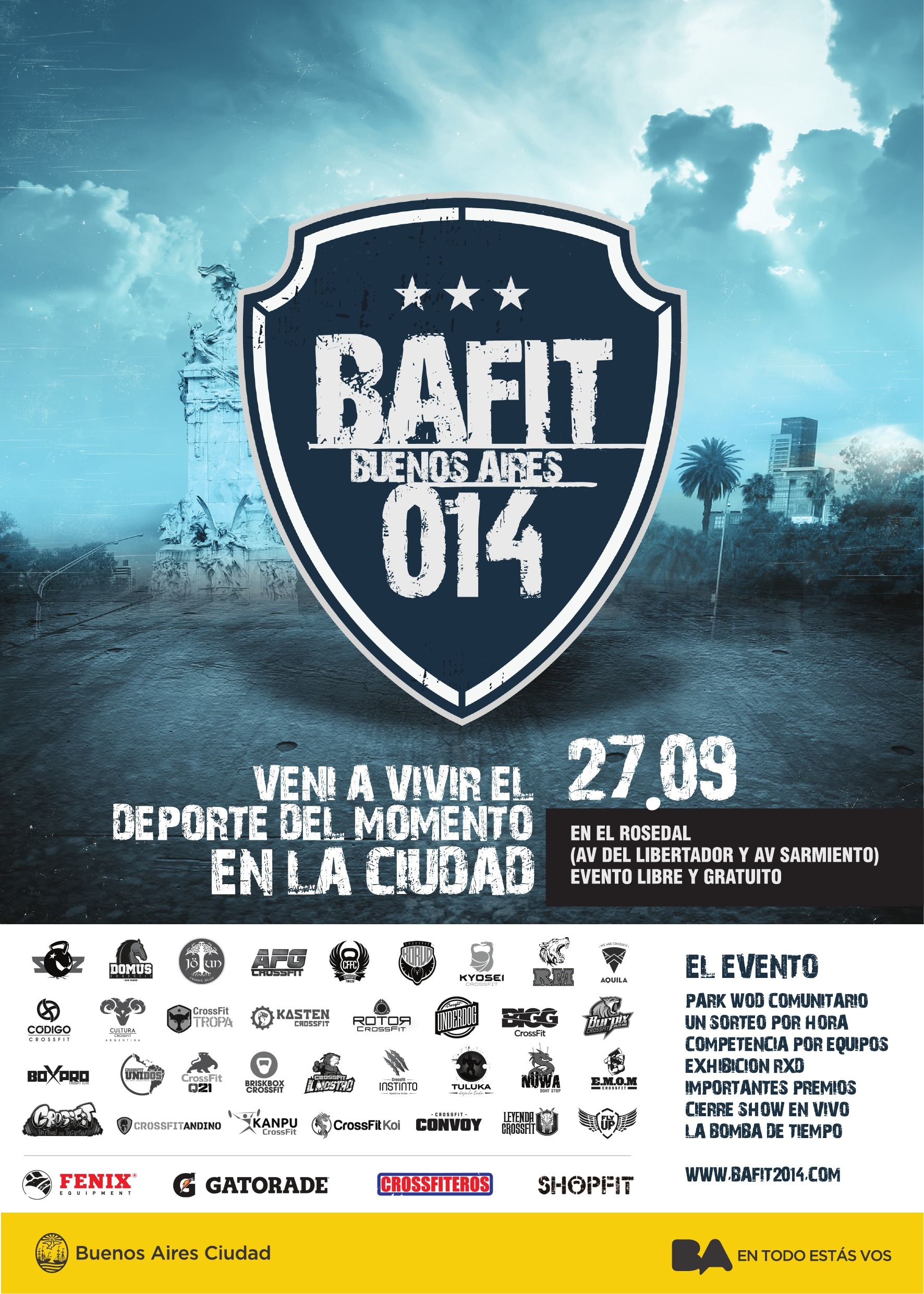 El sábado 27 de septiembre de 11 a 18 h. se llevará a cabo en el Rosedal (Av. Del Libertador y Av. Sarmiento) la primera edición del BAFIT, un evento realizado por gimnasios afiliados a Crossfit, con el fin de promover el deporte, y acercar esta actividad a quienes no la conocen. La jornada tendrá diferentes actividades deportivas y lúdicas, entre las cuales habrá un torneo principal por equipos, en el que compiten los mejores atletas de 32 equipos de Argentina y Uruguay, un taller de levantamiento olímpico a cargo de la ex campeona Natalia Díaz, una clase de FexFit y grandes premios para los ganadores y sorteos para el público.