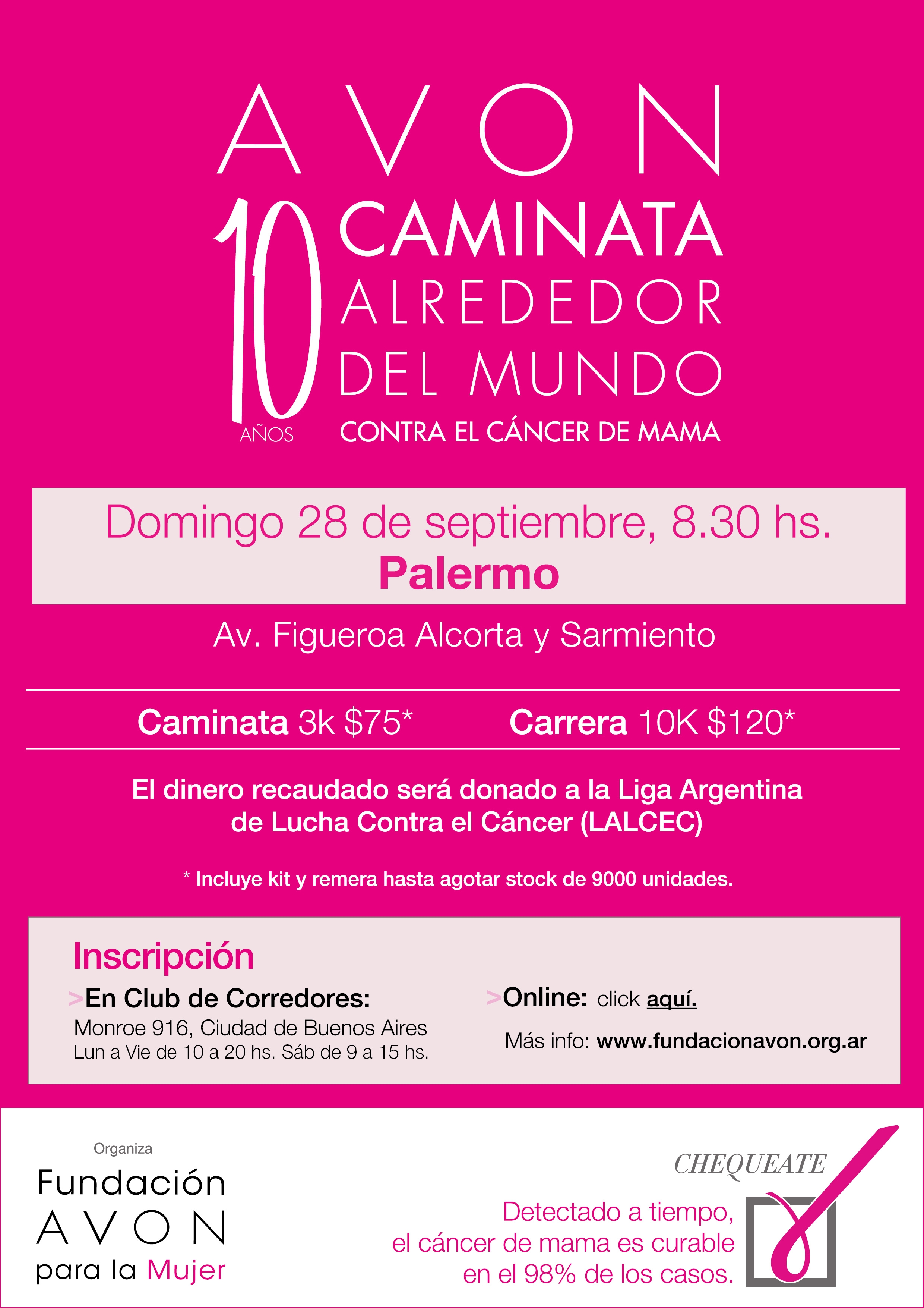 El domingo 28 de septiembre se realizará la Caminata Avon contra el cáncer de mama - 10km y 3km – a las 8.30 h. en Av. Figueroa Alcorta y Av. Sarmiento.