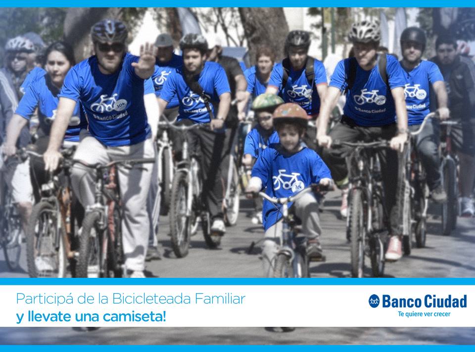 El domingo 26 de octubre a las 10.30 h el Banco Ciudad organiza una Bicicleteada familiar, en Av. Calabria y Padre M. L. Migone, Costanera Sur. Se recorrerá Puerto Madero. Los participantes recibirán una remera de obsequio.