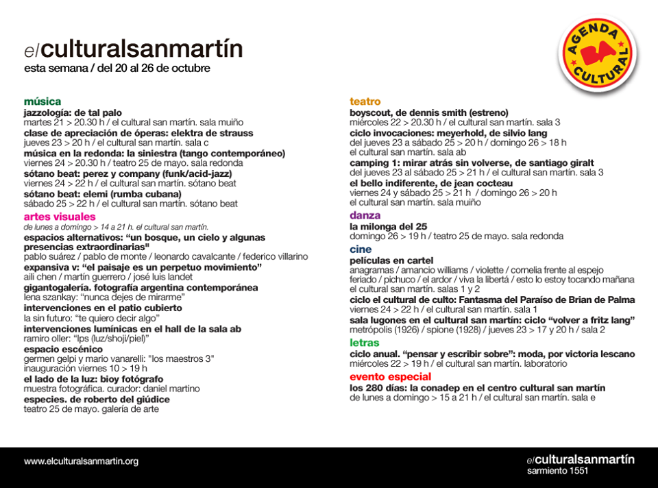El viernes 24 de octubre a las 20.30 h. continúa el ciclo Música en la Redonda con "La siniestra" (Tango contemporáneo). En el Teatro 25 de Mayo, Av. Triunvirato 4444. Entrada gratuita.