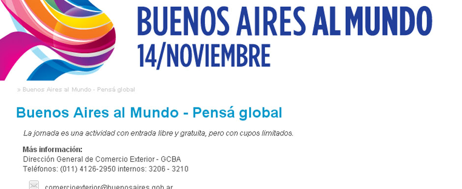 Buenos Aires al Mundo es una jornada de conferencias orientadas a empresarios de diversos sectores que buscan internacionalizar sus empresas y a estudiantes universitarios. Organizado por la Ciudad de Buenos Aires, a través de la Dirección de Comercio Exterior, dependiente del Ministerio de Desarrollo Económico, el evento se realizará este 14 de noviembre (de 9 a 18) en el Consejo Profesional de Ciencias Económicas (Viamonte 1549, CABA).