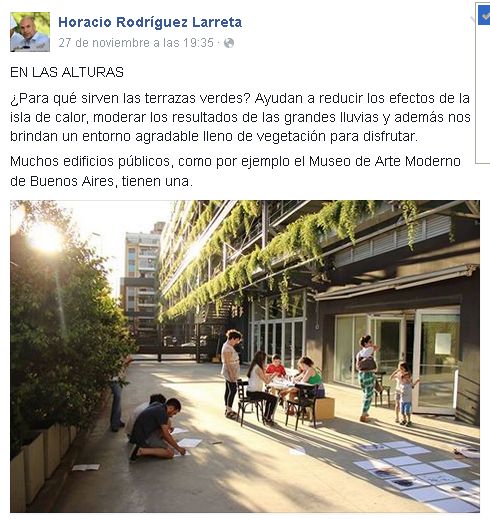 Entre los edificios públicos que ya cuentan o van a contar con terrazas verdes, se pueden mencionar el Museo de Arte Moderno, el nuevo Centro de Convenciones, de Figueroa Alcorta, al lado de la Facultad de Derecho, y el Complejo Escolar Siglo XXI, una construcción destinada a la educación pública que avanza en la calle Holmberg, en Villa Urquiza.