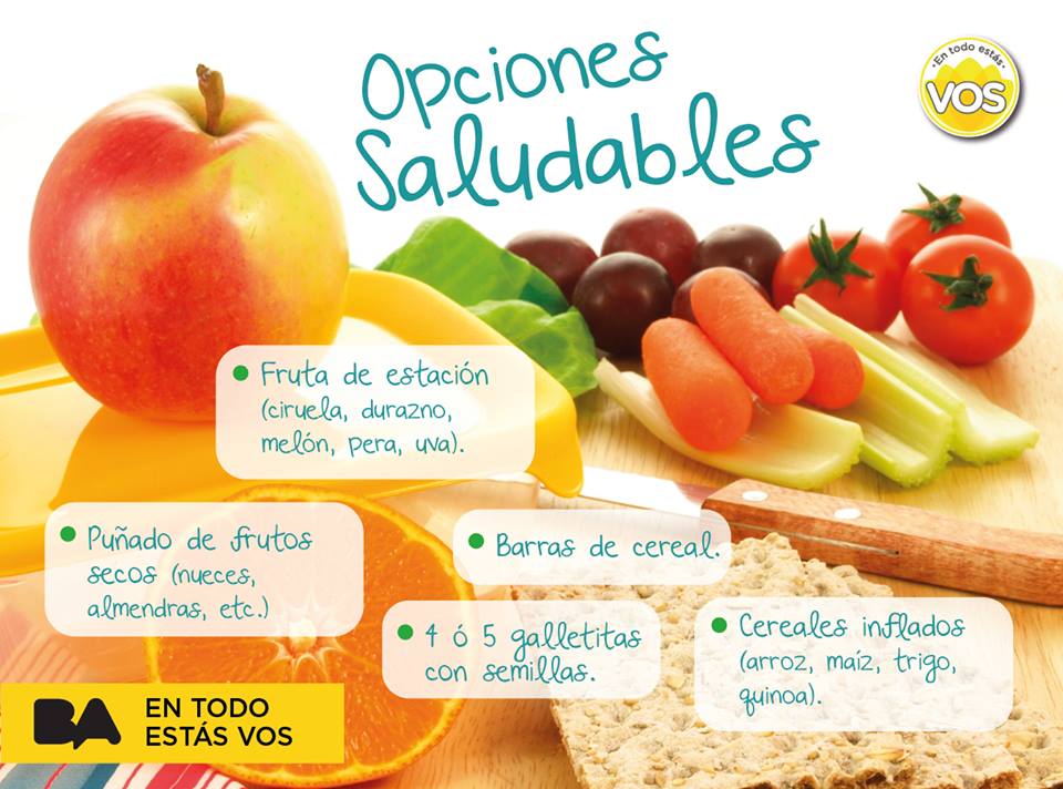 - Sándwiches: con los ingredientes adecuados y moderando las cantidades son siempre una opción saludable. Se recomienda elaborarlos con pan integral, agregar al menos un vegetal y si se emplean fiambres o quesos no utilizar más de tres fetas.