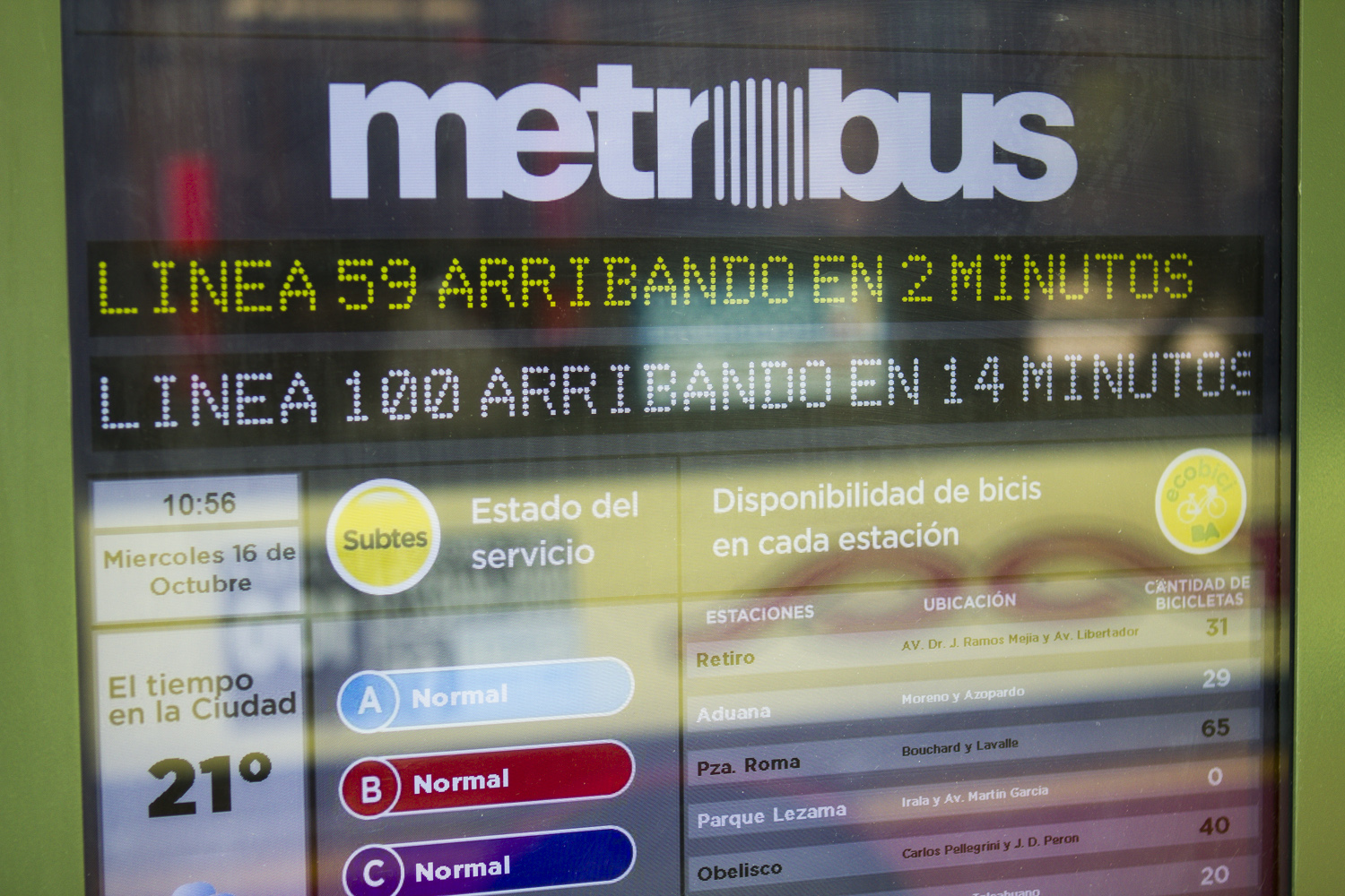 Instaladas en el Metrobus 9 de julio, las pantallas funcionan con tecnología LED e informan también sobre el estado de la red de subtes y la cantidad de bicicletas disponibles las estaciones del sistema público de la Ciudad.