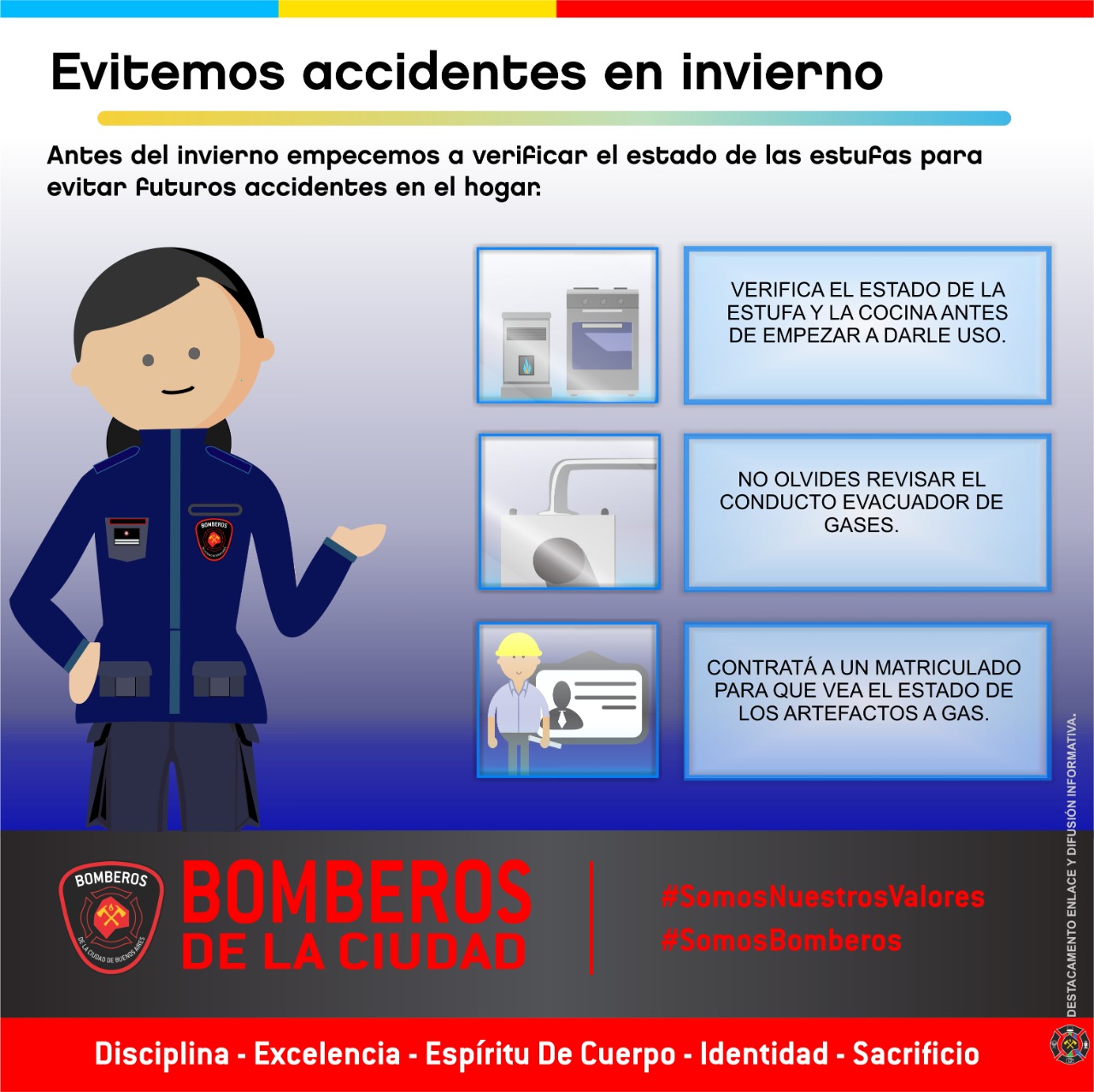 Como primera medida, la Oficina de Investigación de Incendio y Explosiones de Bomberos de la Ciudad aconseja que un gasista matriculado verifique el correcto funcionamiento de los artefactos de gas (calefones, termotanques, cocinas y estufas), el estado de su instalación y de las rejillas de renovación de aire, y corroborar que todas las salidas de los conductos de los artefactos estén sin obstrucciones.