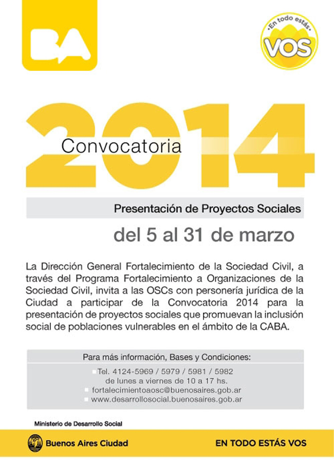 El Gobierno porteño invita a las Organizaciones de la Sociedad Civil, con personería jurídica en la Ciudad, a participar de la Convocatoria 2014 para la presentación de proyectos sociales que promuevan la inclusión social de las poblaciones vulnerables.