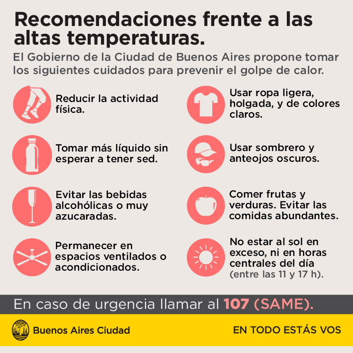 El Ministerio de Salud de la Ciudad Autónoma de Buenos Aires recomienda, ante las altas temperaturas que se pronostican para los próximos días, tomar los cuidados necesarios para prevenir el golpe de calor. Hay que tener en cuenta que el golpe de calor puede afectar a personas de cualquier edad, pero los grupos de mayor riesgo son los niños -que no manifiestan sus síntomas con facilidad- y los mayores de 65 años.