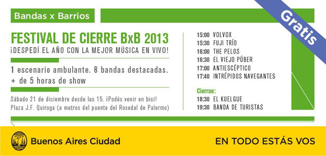Volvox, Fuji Trío, The pelos, El viejo púber, Intrépidos Navegantes y Antiescéptico serán las encargadas de cerrar el ciclo de recitales 2013 de Bandas x Barrios. El sábado 21 de diciembre, de 15 a 20.30 h., un escenario ambulante se instalará en la Plaza Juan Facundo Quiroga del Parque 3 de Febrero para el Festival de cierre de Bandas x Barrios 2013, un evento al aire libre con shows en vivo de seis de las bandas más destacadas del programa. Los recitales de cierre estarán a cargo de Banda de Turistas y El Kuelgue.