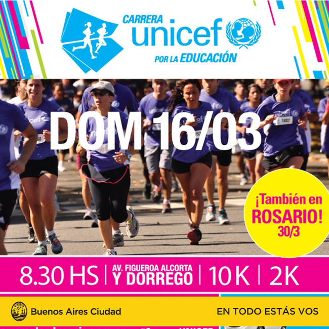 Este año la Carrera UNICEF por la Educación se correrá en dos ciudades, Buenos Aires (el domingo 16 de marzo a las 8.30 h., en Av. Figueroa Alcorta y Dorrego), que contará con el apoyo del Gobierno de la Ciudad de Buenos Aires, y por primera vez en Rosario (30 de marzo).