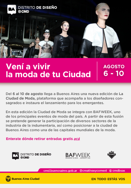En esta edición la Ciudad de Moda se integra con BAFWEEK, uno de los principales eventos de la moda del país. Esta unión apunta a la participación de diversos sectores de la industria de la indumentaria, así como posicionar a Buenos Aires como una de las capitales mundiales de la moda. Entrada libre y gratuita, más información sobre los puntos para retirar entradas.