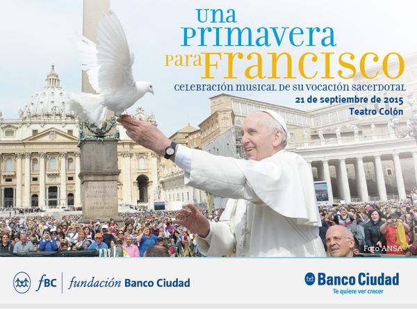 El Papa tendrá su merecido homenaje en la Ciudad. Bajo el título “Una Primavera para Francisco”, el Teatro Colón presentará el próximo lunes 21 de septiembre, a las 20 horas, un festival musical presentado por el Banco Ciudad, a través de la Fundación Banco Ciudad.