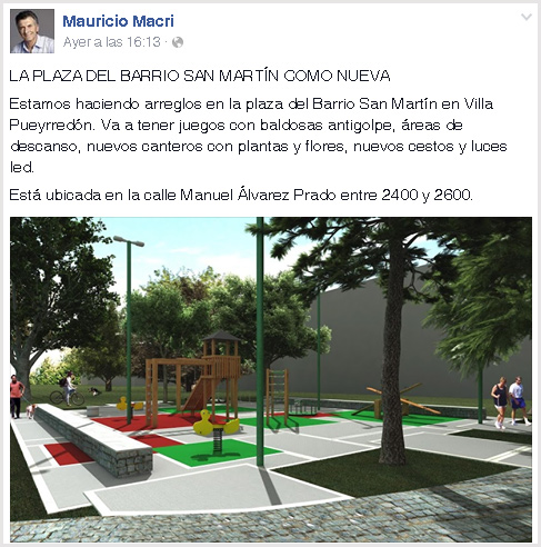 "Estamos haciendo arreglos en la plaza del Barrio San Martín en Villa Pueyrredón. Va a tener juegos con baldosas antigolpe, áreas de descanso, nuevos canteros con plantas y flores, nuevos cestos y luces led. Está ubicada en la calle Manuel Álvarez Prado entre 2400 y 2600", contó Mauricio Macri en su Facebook.