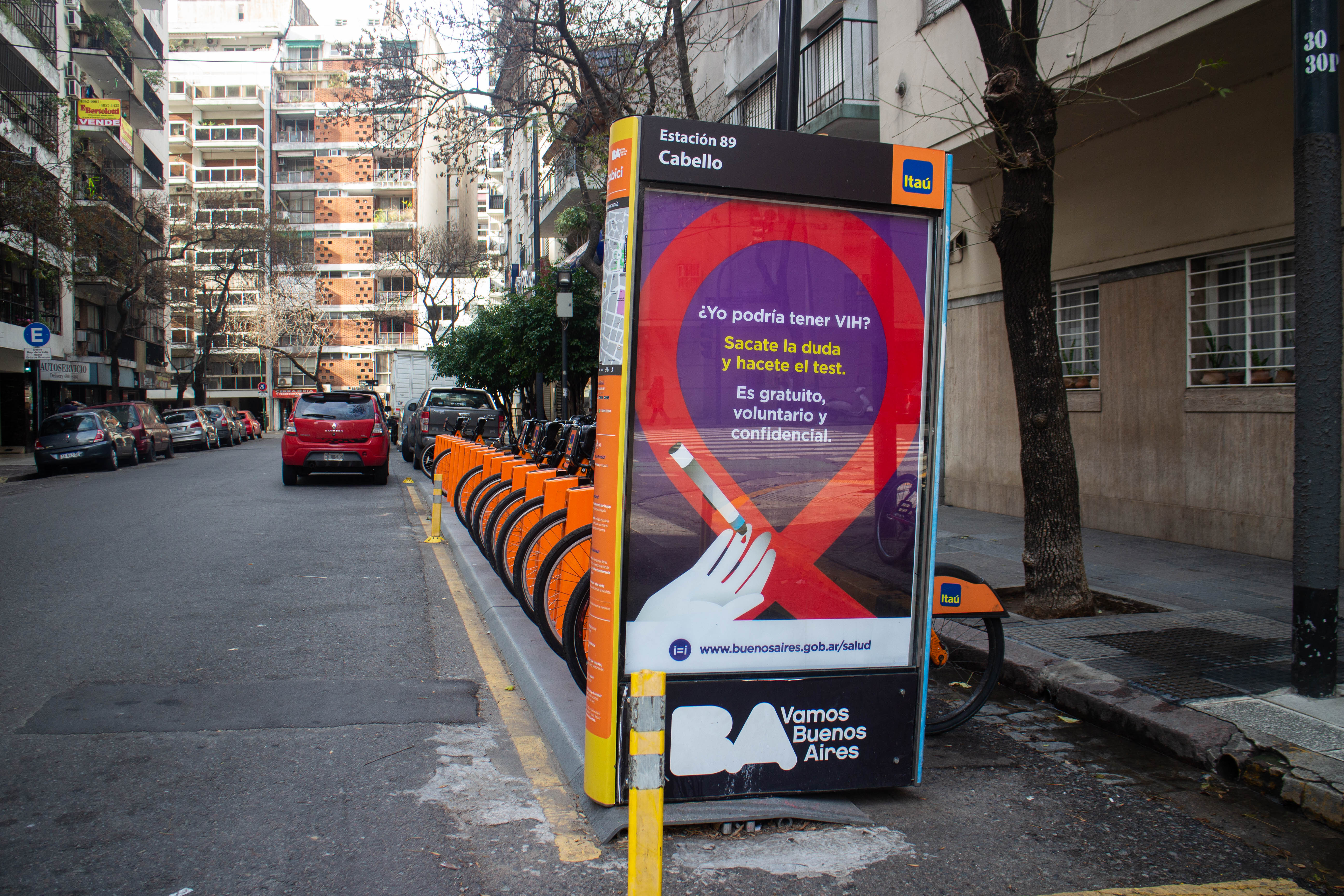Estaciones de Ecobici intervenidas con el cartel de hacete el test de VIH.