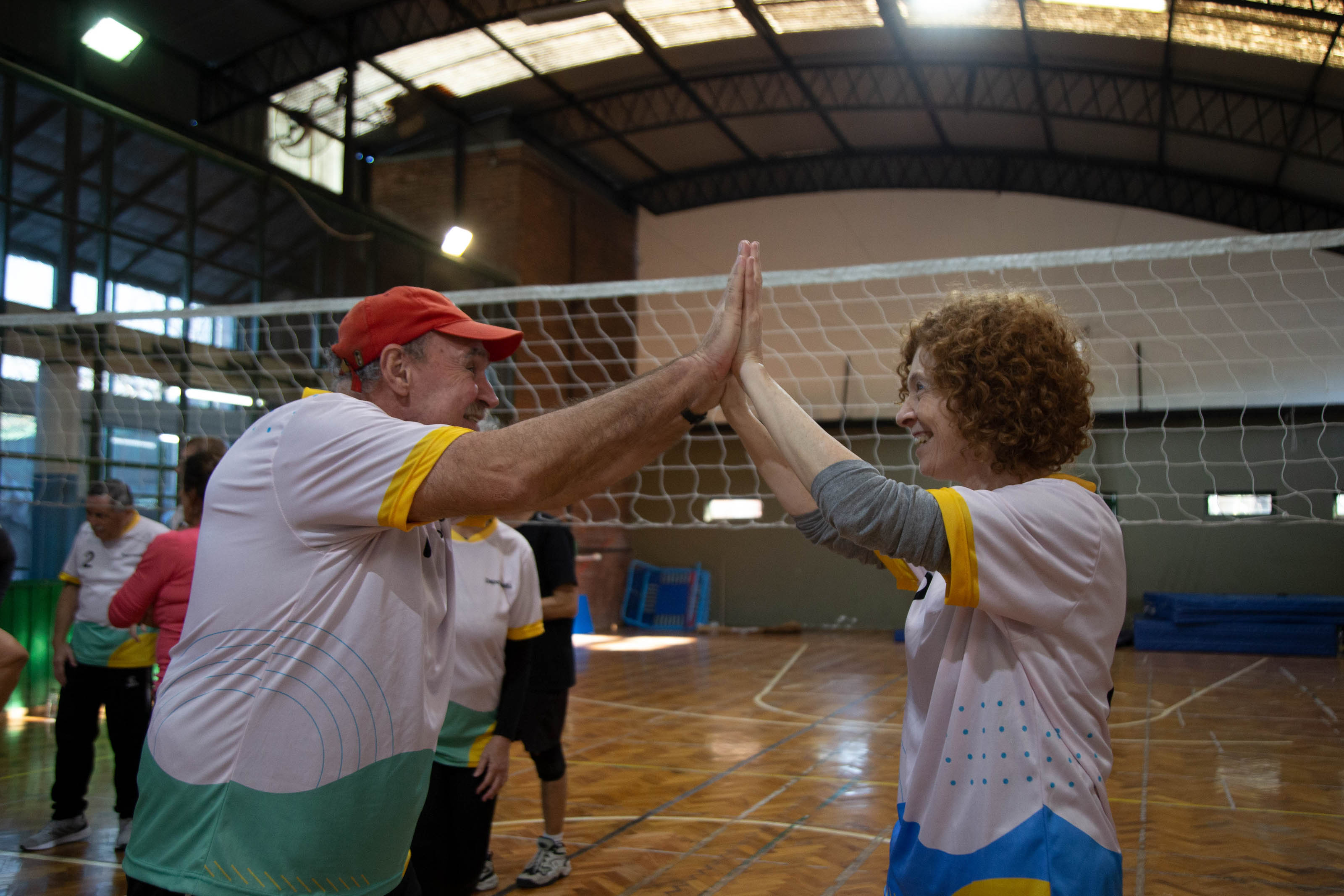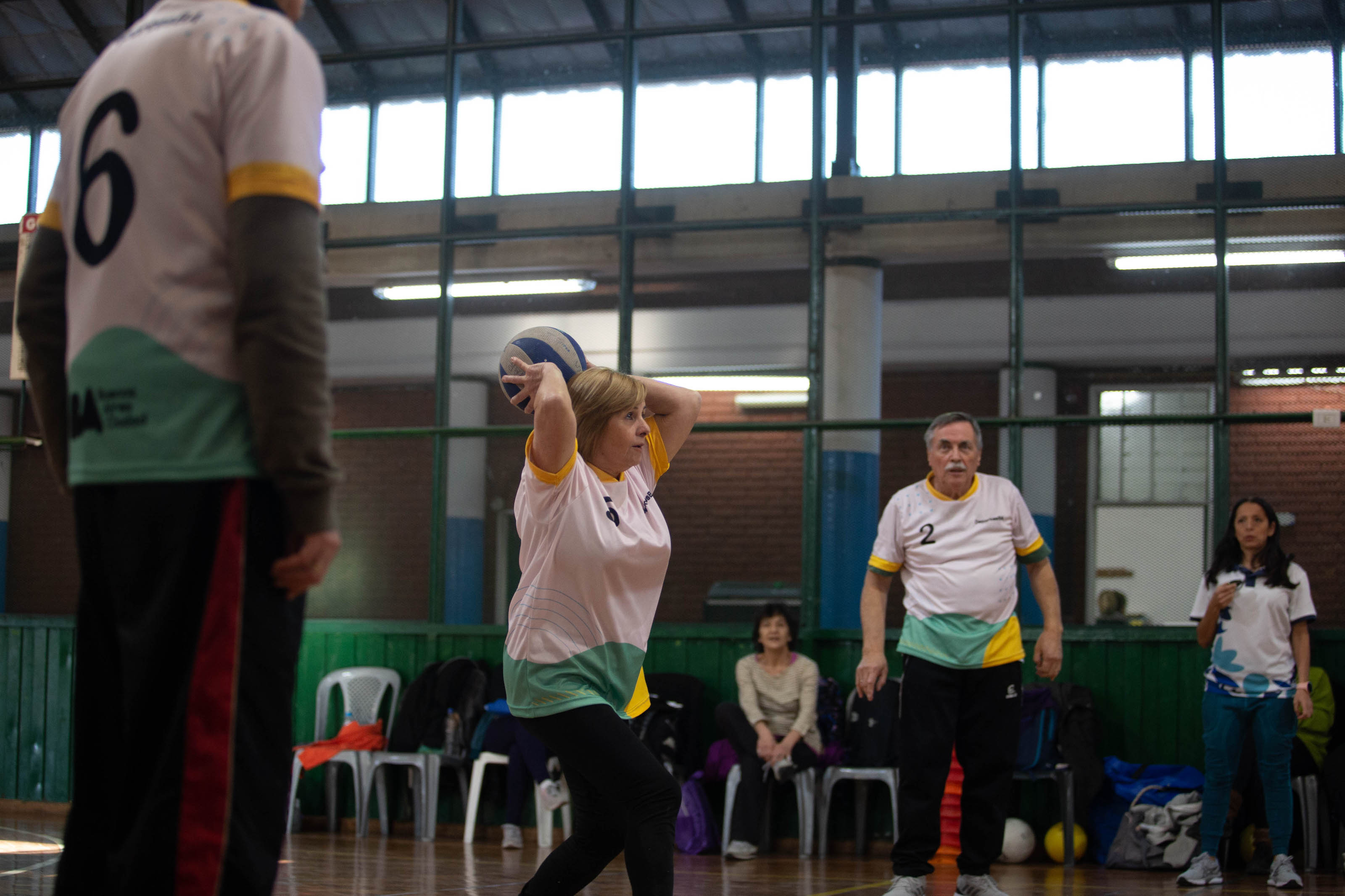 Comparte equipo junto a dos hombres y tres mujeres, todos mayores de 60 años. Del otro lado de la red hay otros seis jugadores. A diferencia del vóley, no rematan. Se pasan la pelota y la lanzan del otro lado de la red. Van rotando de posiciones, para que todos pasen por los distintos sectores de la cancha. Desde afuera reciben aliento. Hay aplausos y risas después de cada punto.