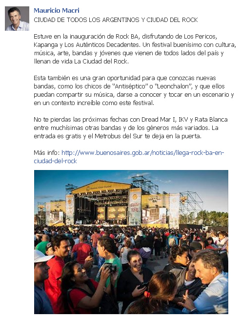 El jefe de Gobierno porteño Mauricio Macri asistió a la inauguración del festival Rock BA, un evento libre y gratuito que se realizará hasta el domingo próximo en la Ciudad del Rock, donde el público podrá presenciar recitales de las mejores bandas de la actualidad.