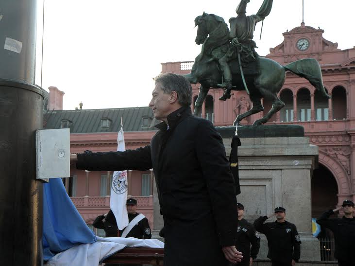 Acompañado por ministros y otros altos funcionarios del Gobierno, legisladores, autoridades judiciales y eclesiásticas y de las Fuerzas Armadas y de Seguridad, Macri encabezó esta mañana el acto oficial conmemorativo del Día de la Independencia frente al mástil de la Plaza de Mayo.