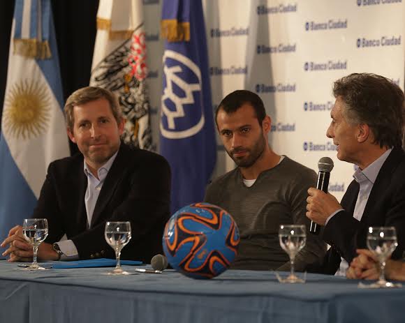 Macri compartió el acto en el que se firmó el convenio esta tarde en la sede central del banco, en Florida 302, junto al futbolista del Barcelona Javier Mascherano y las máximas autoridades del Ciudad, su presidente, Rogelio Frigerio, y el vicepresidente, Juan Curutchet. También Macri estuvo acompañado por el jefe de Gabinete porteño, Horacio Rodríguez Larreta.