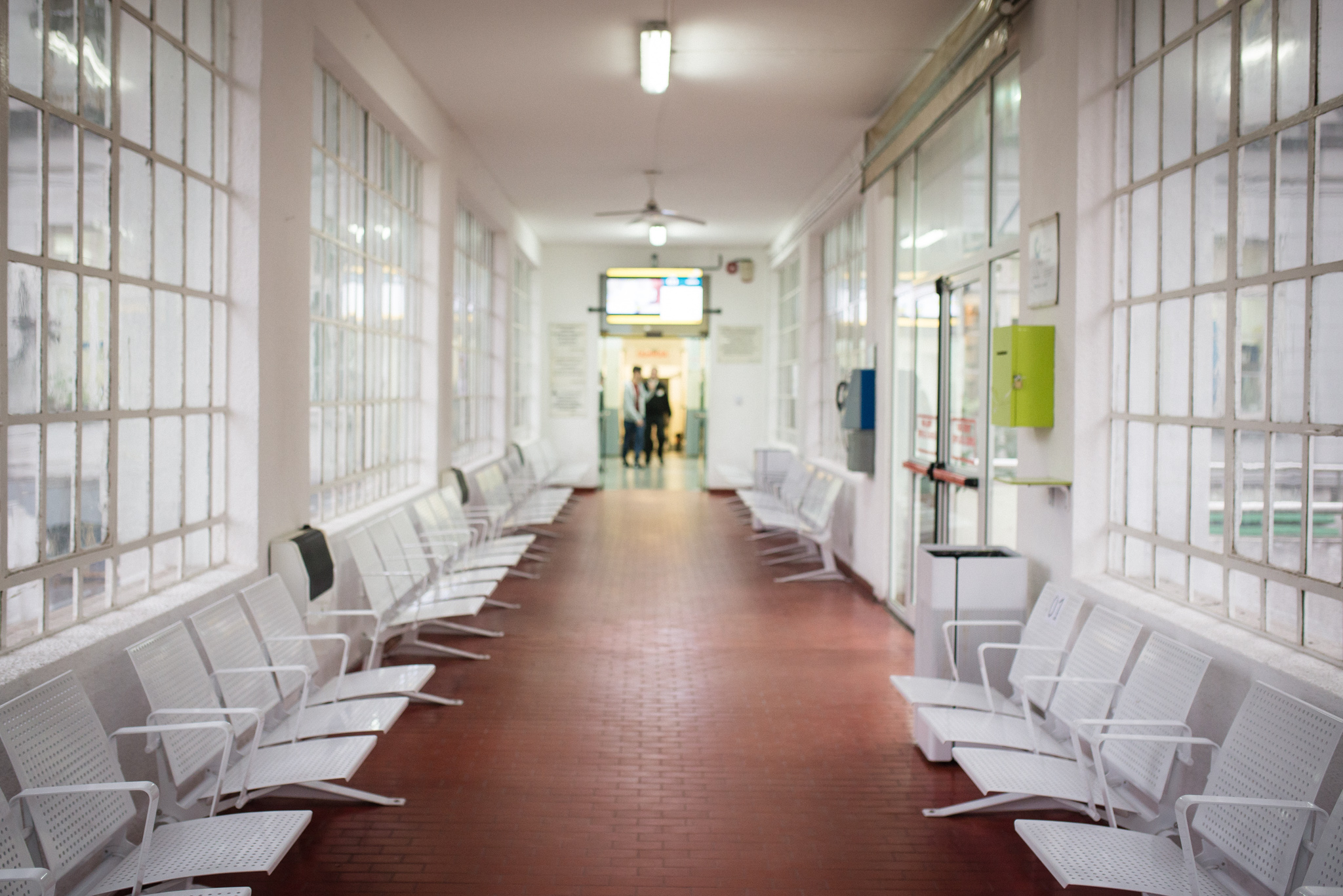 Asimismo se ha colocado un tótem especialmente construido en la vereda con el objetivo de facilitar el reconocimiento del hospital al tiempo que se señaliza el ingreso al mismo. En el hall de ingreso se ha optado por mantener el color de las paredes y combinarlo con tándems blancos que contrastan con el color del piso existente, generando un espacio amplio y prolijo.