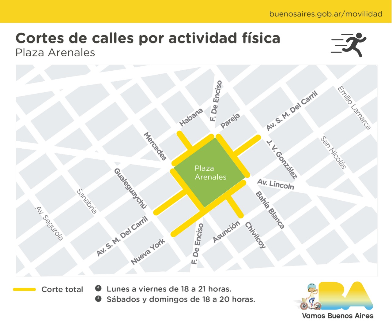 Se trata de cortes totales que suman 14 km lineales y ampliarán el espacio peatonal en las inmediaciones de Plaza Arenales y los parques Tres de Febrero (Bosques de Palermo), Centenario, Saavedra y Chacabuco, para garantizar distanciamiento físico y reducir los riesgos de contagio.