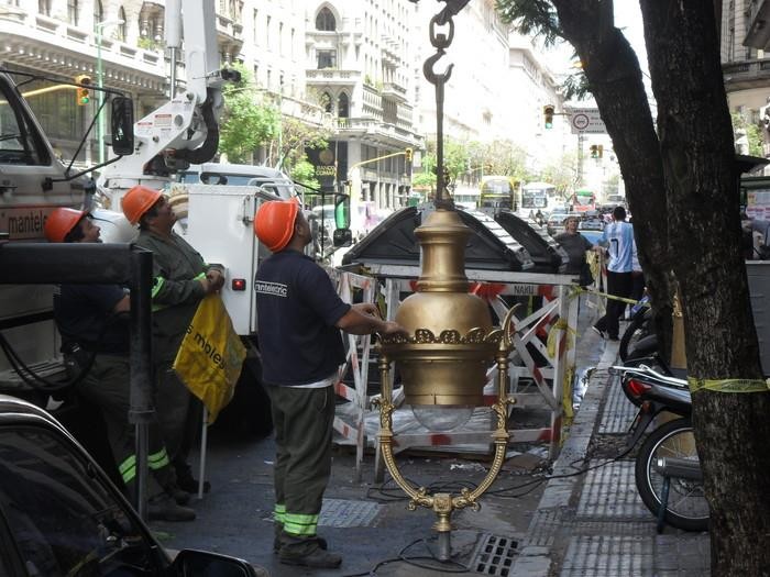 Por otra parte, en Diagonal Sur se está retirando la pintura vieja, gastada y en mal estado de las farolas y los postes. Se la está reemplazando por una nueva capa de color dorado, para que coincidan con las luminarias de Diagonal Norte.
