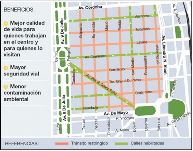 La prohibición para circular en el perímetro comprendido por Avenida Córdoba, Carlos Pellegrini, Avenida De Mayo y Avenida Leandro N. Alem, afecta sólo a los autos particulares los días hábiles de 11 a 16, excepto que cuenten con una cochera en la zona y tengan el permiso correspondiente. Las ambulancias, servicios fúnebres, grúas, patrulleros, taxis, camiones de caudales, distribuidores de carga y descarga, pueden ingresar sin inconvenientes.