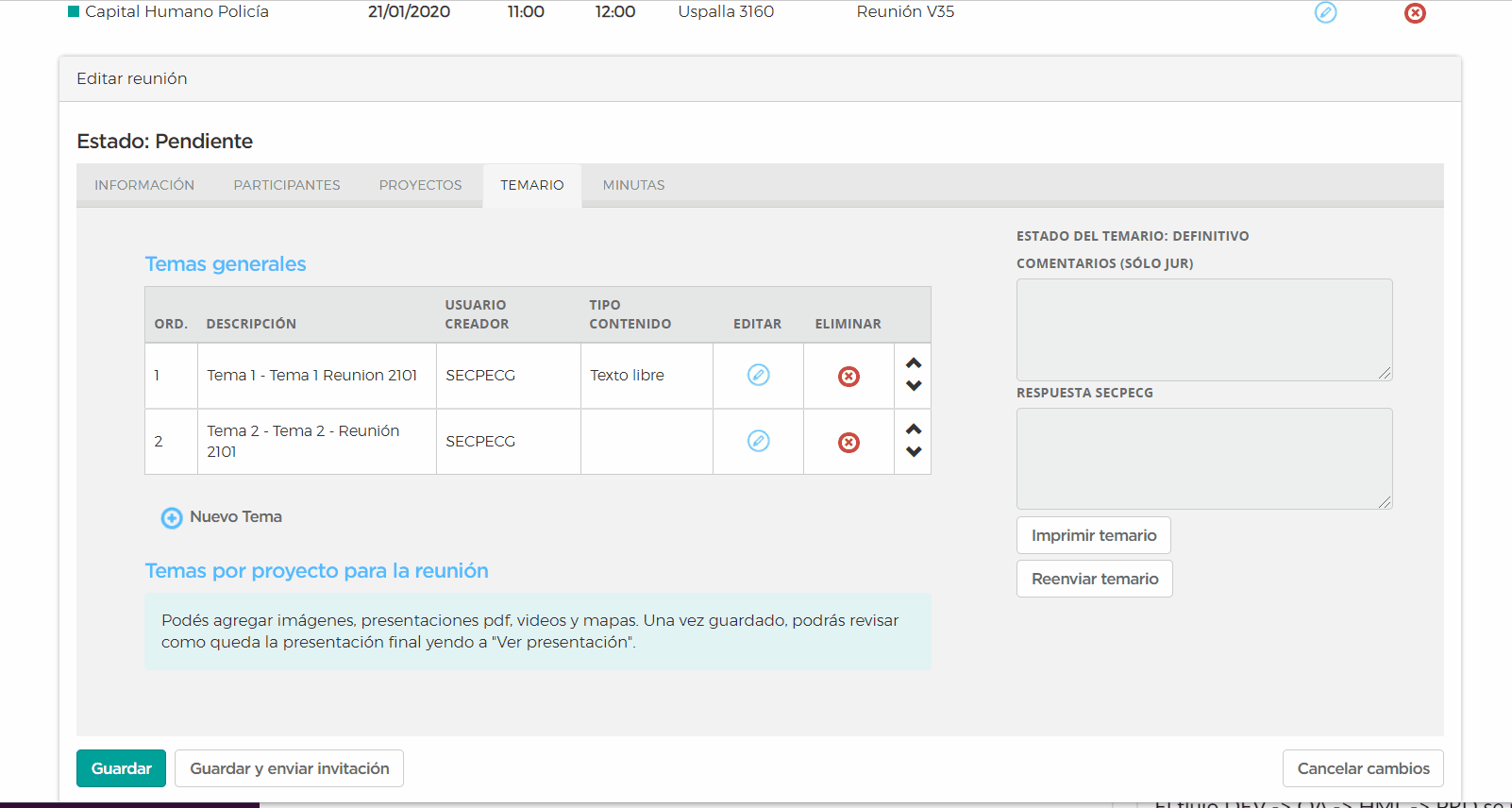 3) Reenviar el temario: en esta acción permitirá reenviar el temario en caso de replanificar o realizar cambios en el temario de la reunión