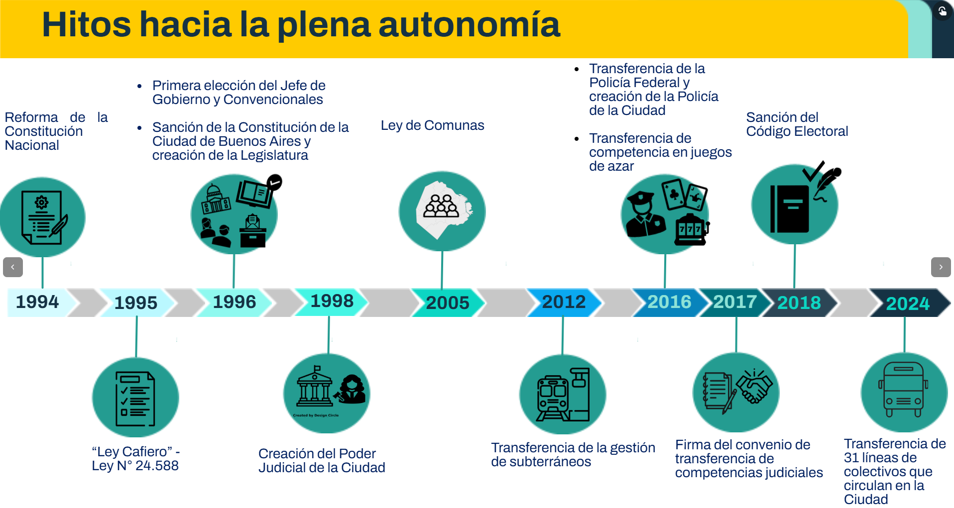 A lo largo de las tres últimas décadas, hubo avances significativos que consolidaron el carácter autónomo de nuestra Ciudad. Al respecto, encontramos hitos tales como la sanción de la Constitución local (1996); la creación del Poder Judicial porteño (1998); la aprobación de la Ley N° 1.777 Orgánica de Comunas (2005); la transferencia de la gestión de los subterráneos (2012), de la Policía Federal (2016); la firma del convenio de transferencia de competencias judiciales (2017); la sanción del primer Código Electoral (2018) y el reciente traspaso de las 31 líneas de colectivos que circulan íntegramente por CABA (2024).